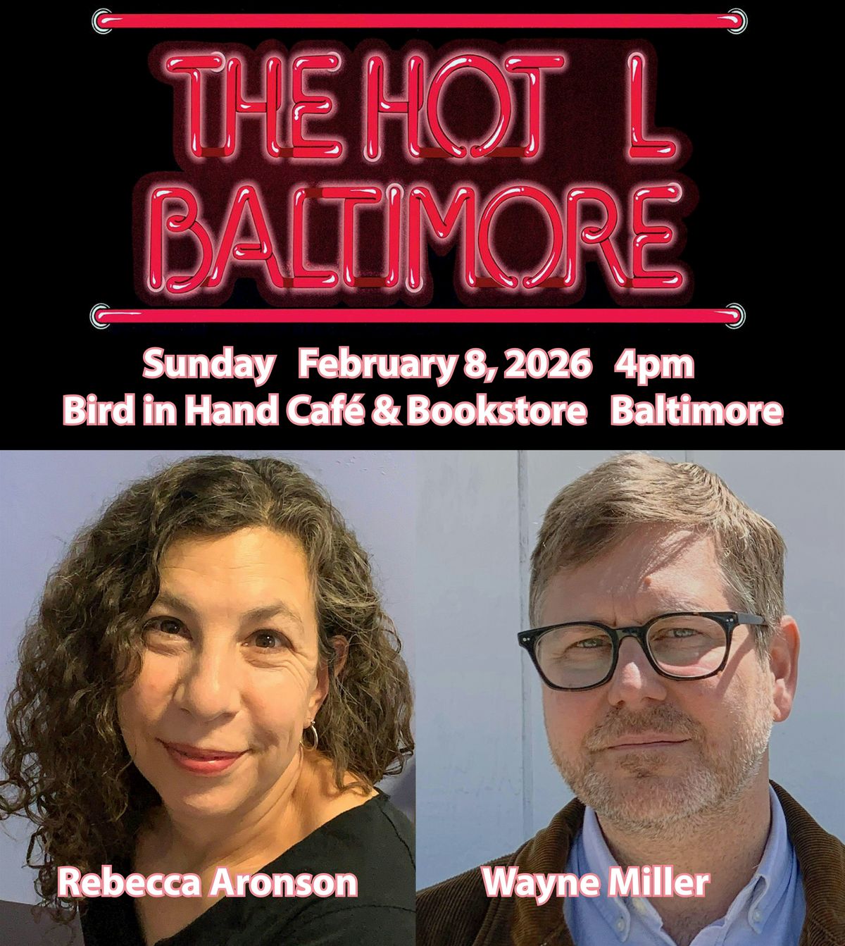 Sunday February 8, 2026 at 4pm, The HOT L Poets Series continues at Bird in Hand (Baltimore) with poets Rebecca Aronson & Wayne Miller!