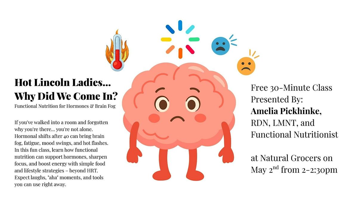 If you've walked into a room and forgotten why you're there... you're not alone. Hormonal shifts after 40 can bring brain fog, fatigue, mood swings, and hot flashes. In this fun class, learn how functional nutrition can support hormones, sharpen focus, and boost energy with simple food and lifestyle strategies – beyond HRT. Expect laughs, "aha" moments, and tools you can use right away.