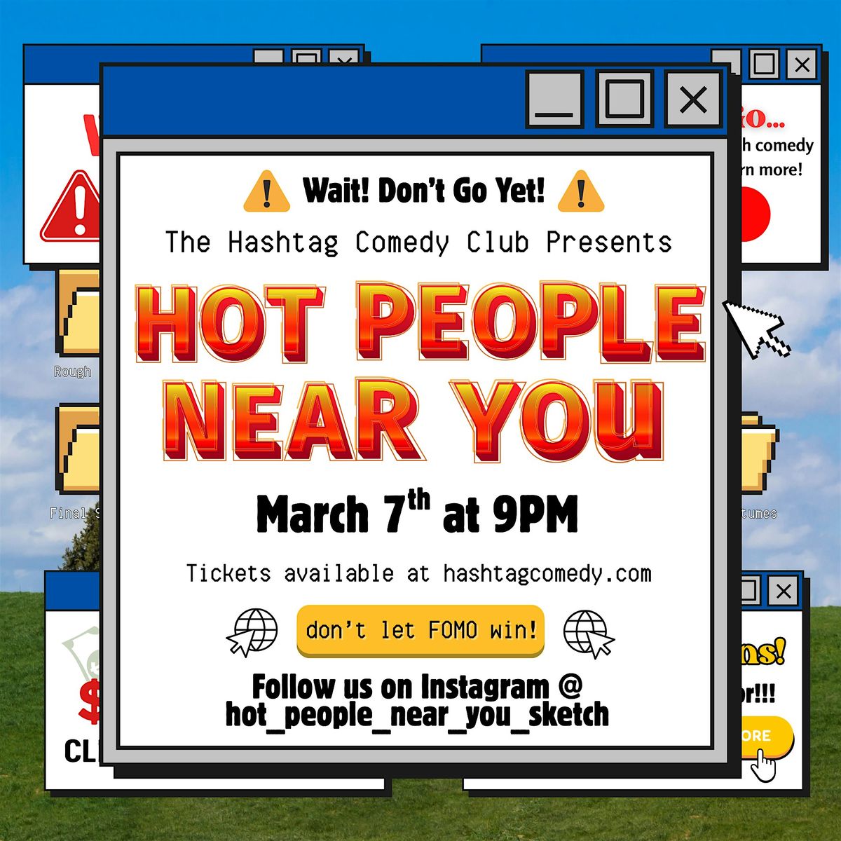 This is the show for you!"Hot People Near You" is presented by Hashtag Comedy Company and combines the talents of sketch/improv players from current and former comedy groups including: Monday Night Live, Actual Wolves, Backburner Comedy, Artificial Idiocy and more!