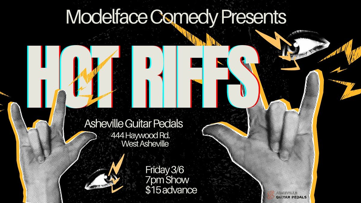 Hot Riffs Comedy features the best local and regional comedians on the iconic AVL Guitar Pedals stage in West Asheville.