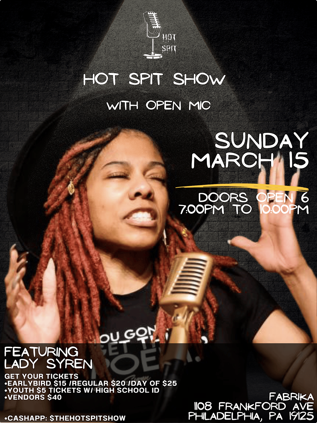 The hot spit show hits the live stage.The show opens up with an open mic, rooted in spoken word poetry but other art forms are welcomed. Then the featured artist pours their heart on stage and then takes on the hot spit challenge live. if you are unfamiliar with the hot spit challenge, Artist will eat a hot chip and then perform for the crowd while their mouth is on fire. Throughout the niht we'll have two hot spit challenger as well. If you’re not scared you can sign up to take the challenge too. It’s your chance to prove that what you spit is fire. this is a show that you won’t want