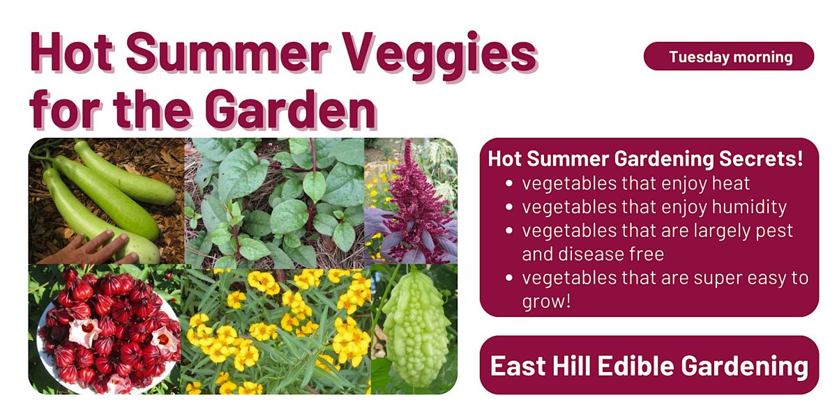 Our summers may be hot and humid, but you can still have a productive and attractive edible garden if you know the right things to grow. There are a lot of vegetables that thrive in our subtropical summer. Some you already know. Others from around the world may be unfamiliar now, but will soon make their way onto your menu of favorites. Join East Hill Edible Gardening to learn about an array of interesting and unusual vegetables that you can grow during the hottest part of the year.