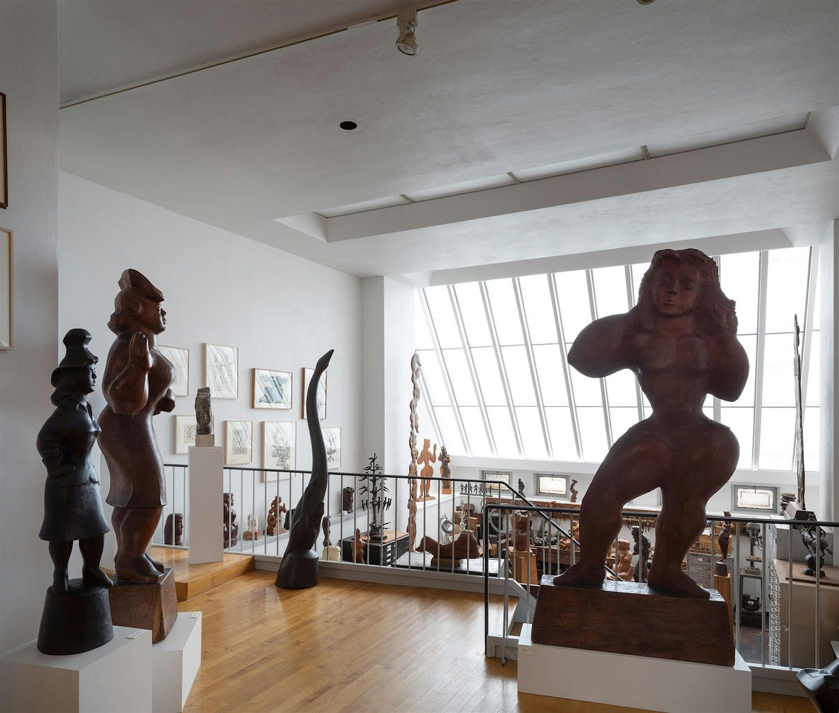 The first floor includes Gross's first-floor sculpture studio and gallery, renovated in 1963 by the artist with architects Arthur Malsin and Don Reiman. The third floor houses the Grosses' living and dining spaces, featuring hundreds of works from their extensive private art collection. The installaion includes important American paintings by Marsden Hartley, Willem de Kooning, Milton Avery, Jacob Lawrence, Louise Nevelson, and others. In addition to works by American artists and friends, the collection includes African, European, Pre-Columbian, Oceanic, and decorative arts, preserved as it looked during Gross's lifetime. The second floor houses a temporary exhibition space.