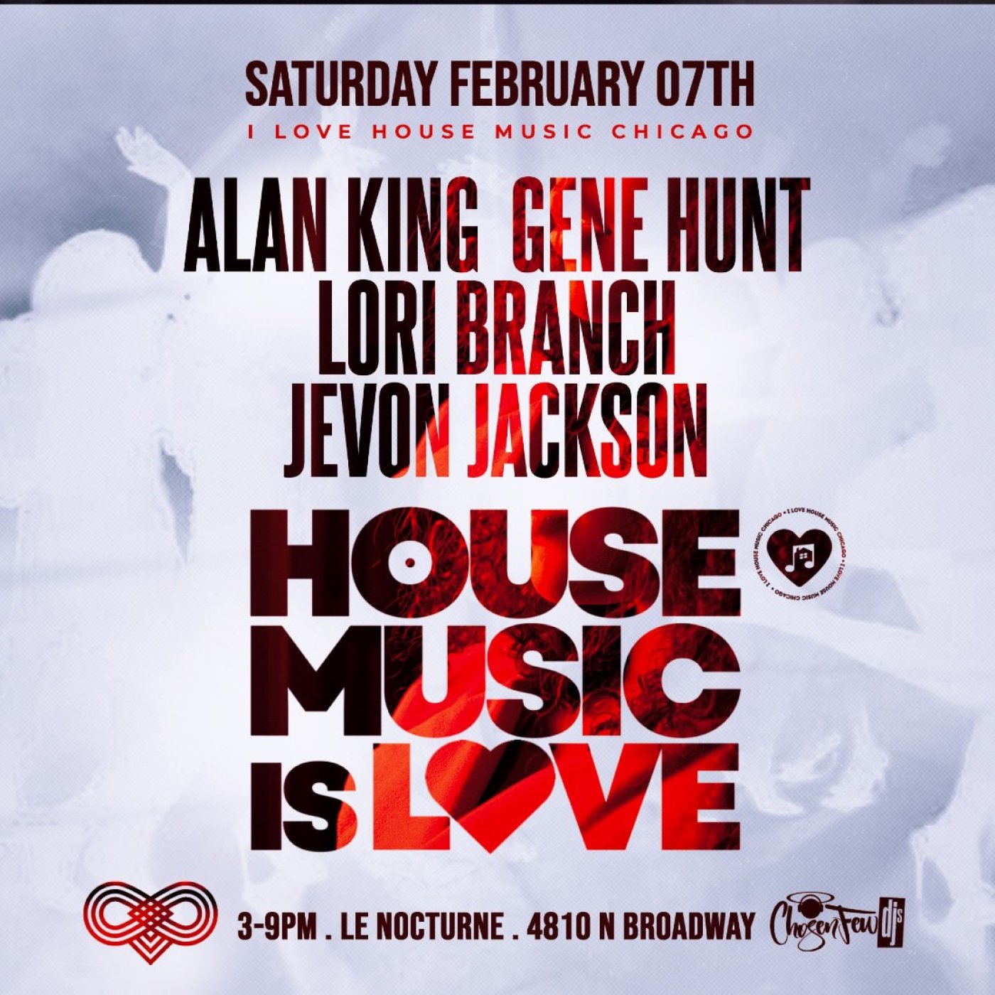 House Music is Love day party. Chosen Fews Alan King DJ with Gene Hunt, Lori Branch and Jevon Jackson at Le Nocturne 3p-9pm.