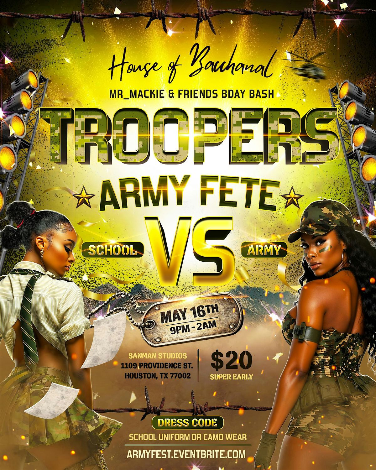 Get ready for a blast at House of Bacchanal - TROOPERS ARMY Fest, where the party never stops! Camo attire recommended. Music, Drinks, Fun!About this Event