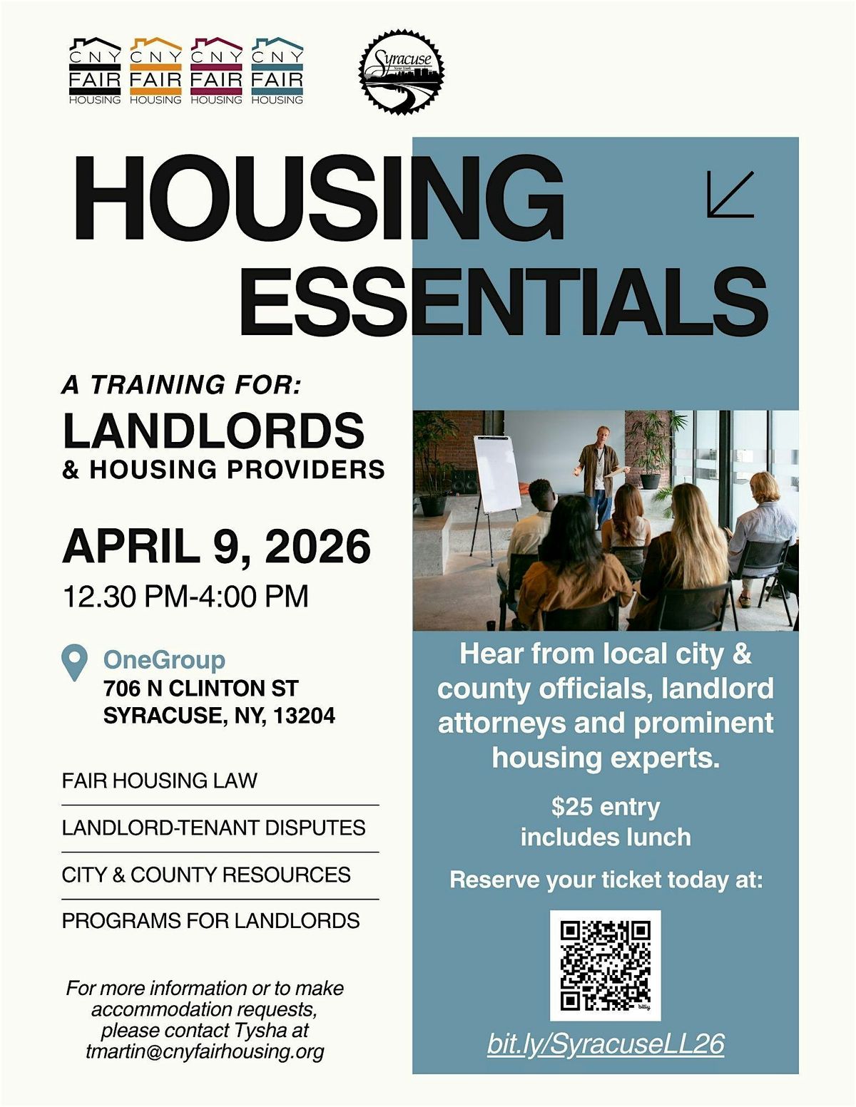 CNY Fair Housing, in collaboration with the City of Syracuse, invite you to join us for a 3-hour landlord training, where you will gain valuable insight from expert guest speakers from the following agencies: