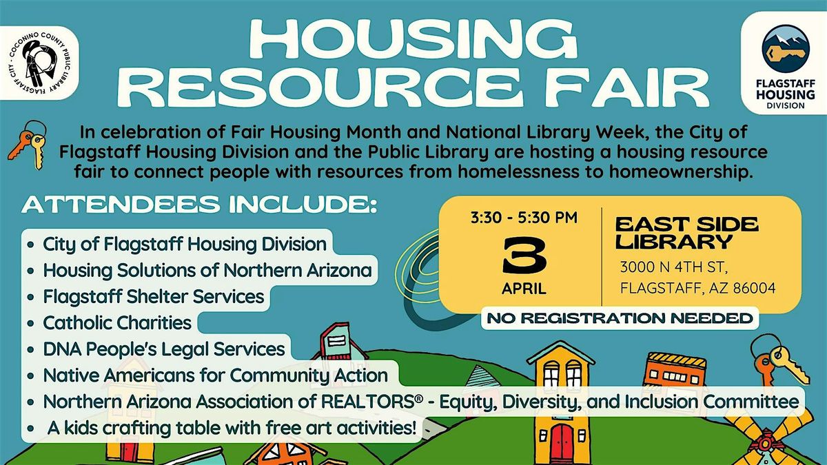 Welcome to the Housing Resource Fair at the East Flagstaff Community Library! In celebration of Fair Housing Month and National Library Week, the City of Flagstaff Housing Division and the Public Library invite you to join us on April 3, 2026 at 3:30 PM to learn about housing resources, from homelessness to homeownership.