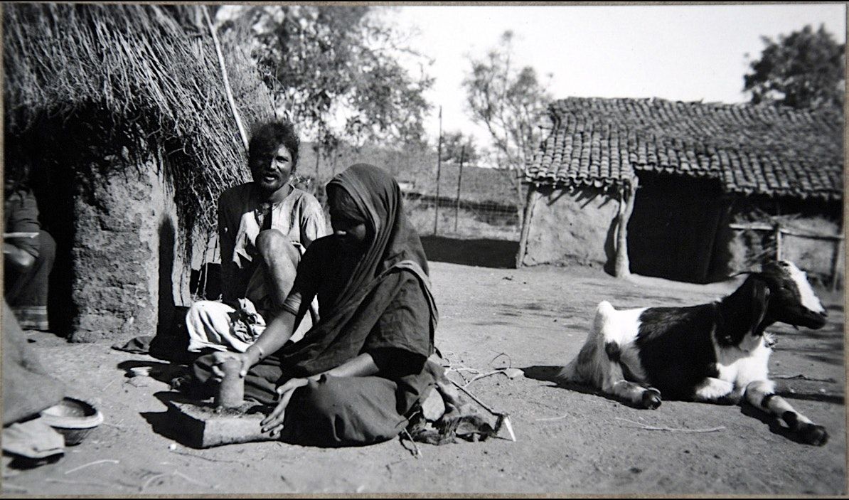 Image: A woman grinds spices for curry, Hubli District, India. Photographer: Marguerite Milward, 1935.