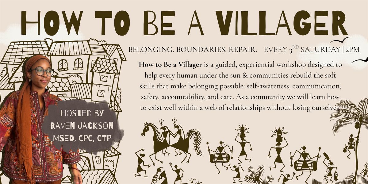 How to Be a Villager is a guided, experiential workshop designed to help individuals and communities rebuild the soft skills that make belonging possible: self-awareness, communication, safety, accountability, and care.