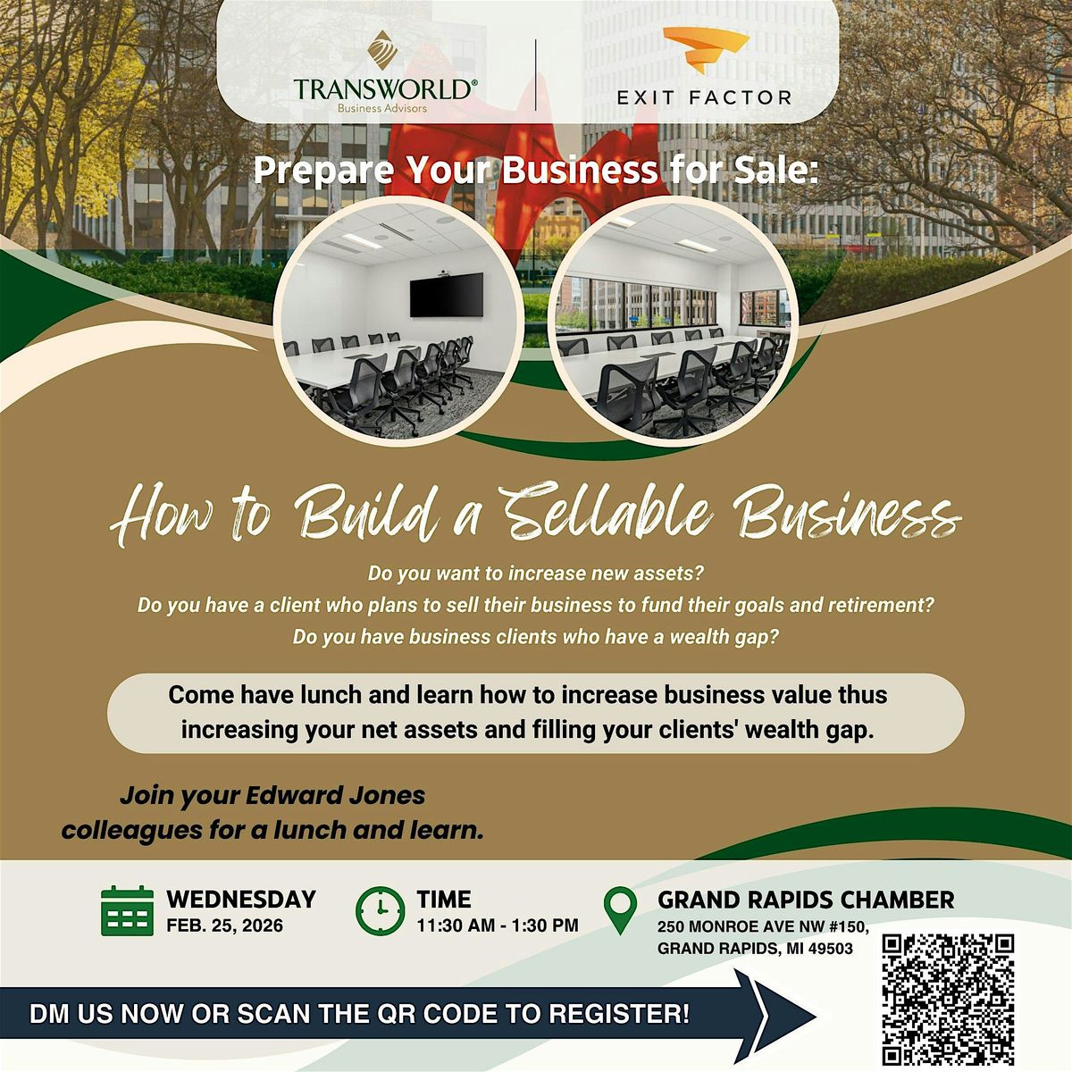 Join us at the Grand Rapids Chamber for an insightful seminar on building a sellable business. Whether you are looking to sell your business in 1, 3, 5 or 10 years, come learn valuable tips and strategies from industry experts that will help you increase the value of your business and make it attractive to potential buyers. This in-person event is a fantastic opportunity to network with like-minded individuals and gain practical knowledge to take your business to the next level. Don't miss out on this valuable seminar!