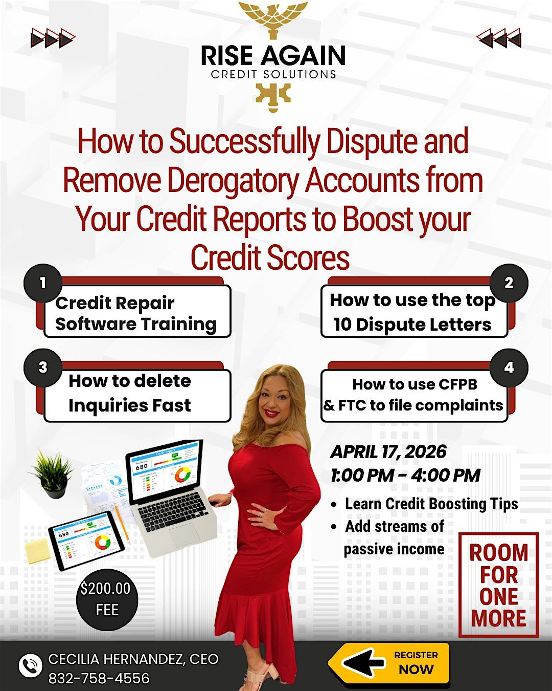 Discover how to successfully dispute and remove derogatory accounts from all three credit bureaus. Get training on using the top credit disputing software and the top 10 dispute letters, plus learn how to leverage the Consumer Financial Protection Bureau and Federal Trade Commission to your advantage. Pick up credit-boosting strategies, explore ways to add passive income, and gain insights from an industry expert with over seven years of experience in this engaging four-hour training session. This Class is NOT FREE -
