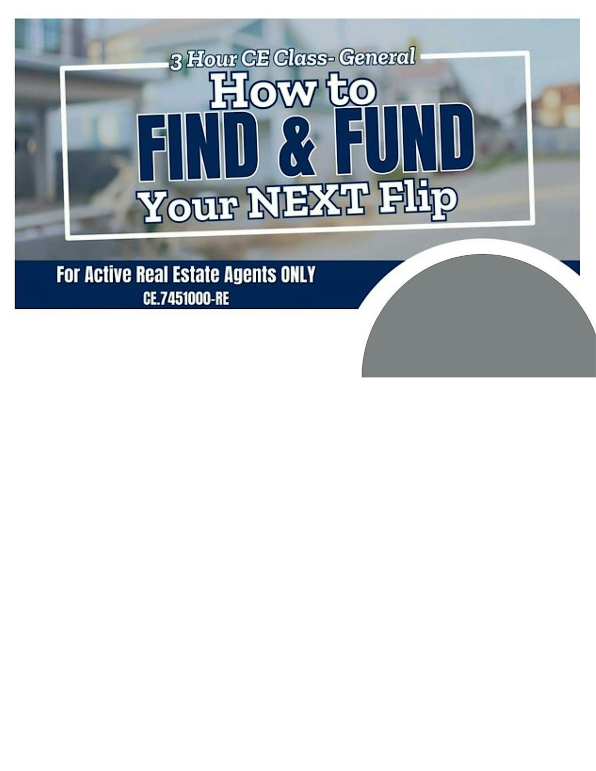 This will be a fun and informative 3 Hour CE (General) session designed to help you discover the best ways to find great property flips and secure the funding you need. This is an in-person event where you'll get tips, tricks, and real-world advice to boost your flipping game. Perfect for real estate enthusiasts ready to take their next project to the next level!
