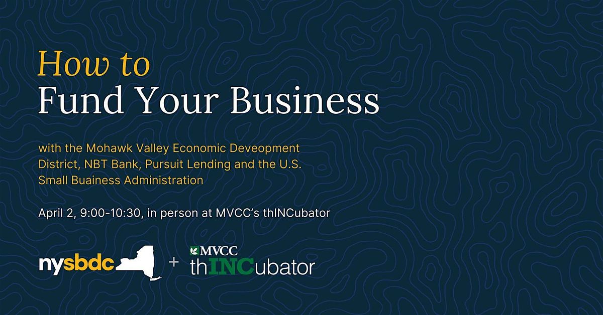 Join the Mohawk Valley Small Business Development Center and MVCC’s thINCubator for this informative session, where you’ll learn about a variety of funding options for your new or existing small business. Presenters from the Mohawk Valley Economic Development District, NBT Bank, Pursuit Lending, and the U.S. Small Business Administration will share updates about their lending programs and actionable steps you can take to prepare to apply for funding. After the seminar, presenters will be available for brief one-on-one meetings to discuss your funding needs.