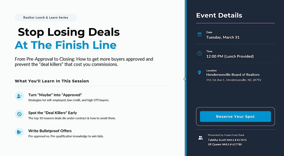 Presented by HomeTrust Bank: From Pre-Approval to Closing: How to get more buyers approved & prevent the deal killers.About this Event