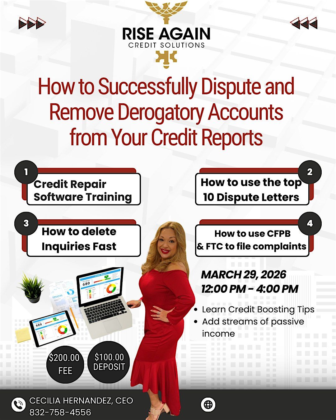 Discover how to successfully dispute and remove derogatory accounts from all three credit bureaus. Get training on using the top credit disputing software and the top 10 dispute letters, plus learn how to leverage the Consumer Financial Protection Bureau and Federal Trade Commission to your advantage. Pick up credit-boosting strategies, explore ways to add passive income, and gain insights from an industry expert with over seven years of experience in this engaging four-hour training session.