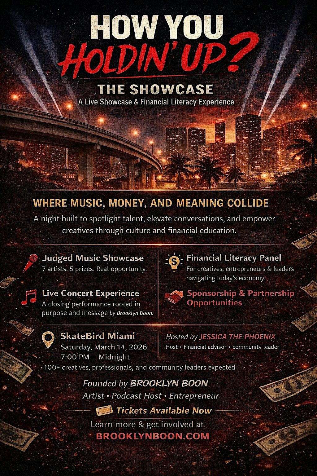 Join us for an unforgettable evening of music, empowerment, and community! Experience a live judged music showcase, a financial literacy panel designed for creatives and entrepreneurs, and a closing concert performance by Brooklyn Boon.