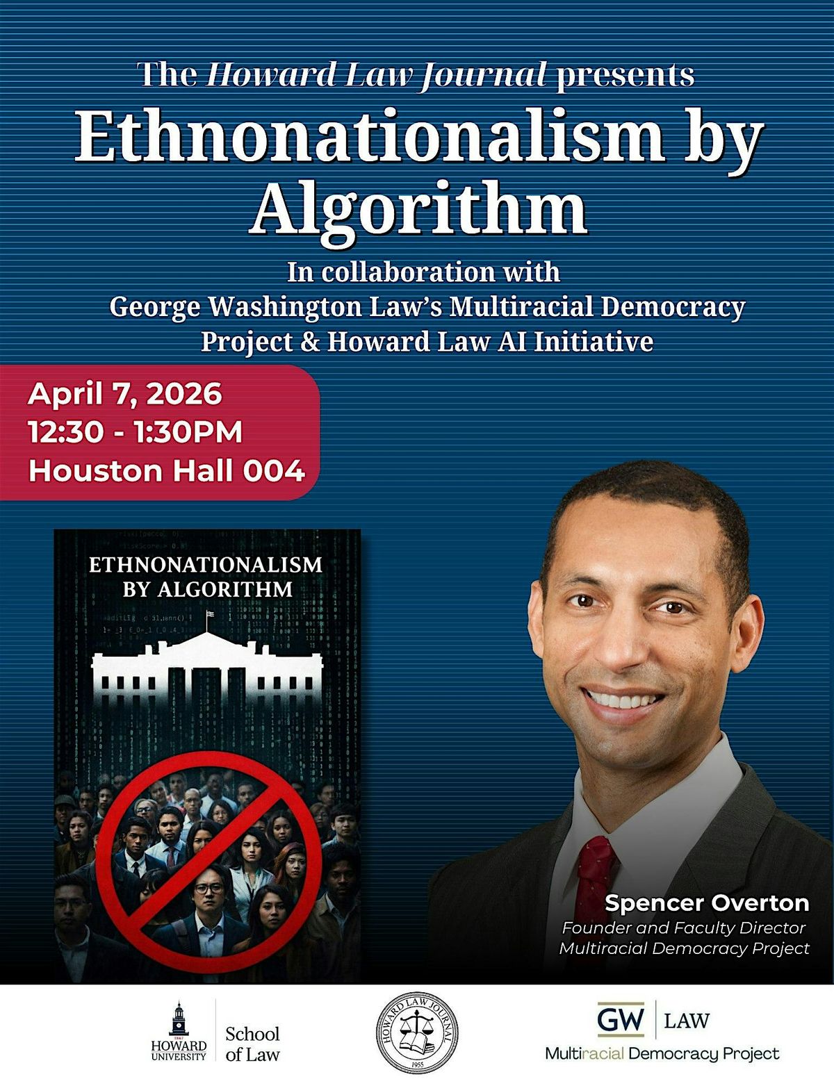 Join us for an insightful talk by Spencer Overton titled "ETHNONATIONALISM BY ALGORITHM" on April 7, 2026, from 12:30 PM to 1:30 PM. This event is proudly co-sponsored by the Multiracial Democracy Project and the Howard Law’s AI Center. Following the presentation, there will be a dedicated Q&A session providing students with the unique opportunity to engage directly with Professor Overton and explore the intersections of technology and democracy.