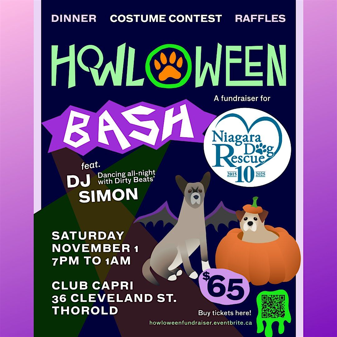 This Halloween event will be held at and catered by Club Capri, in Thorold. Tickets are $ 65 (plus EventBrite fees), included with ticket cost, is a buffet pasta dinner. There will be a cash bar. Thrilling beats by DJ Simon at Dirty Beats. 50/50 and penny raffles will be availible, all proceeds going to the rescue dogs. There will also be adoptable dogs, in costume attending!