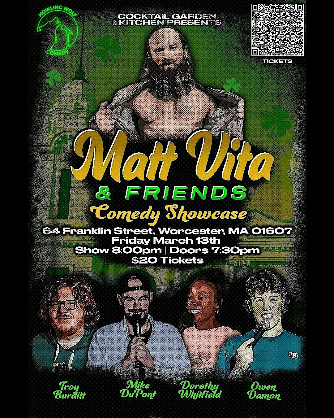 Come join us for a night of laughter and fun at our Comedy Showcase happening Cocktail Garden and Kitchen. Get ready to enjoy some hilarious stand-up acts in a cozy setting. The event will take place at 64 Franklin street in Worcester, so mark your calendars (Friday March 13th at 8:00pm) and bring your friends along for a night of good vibes and comedy.