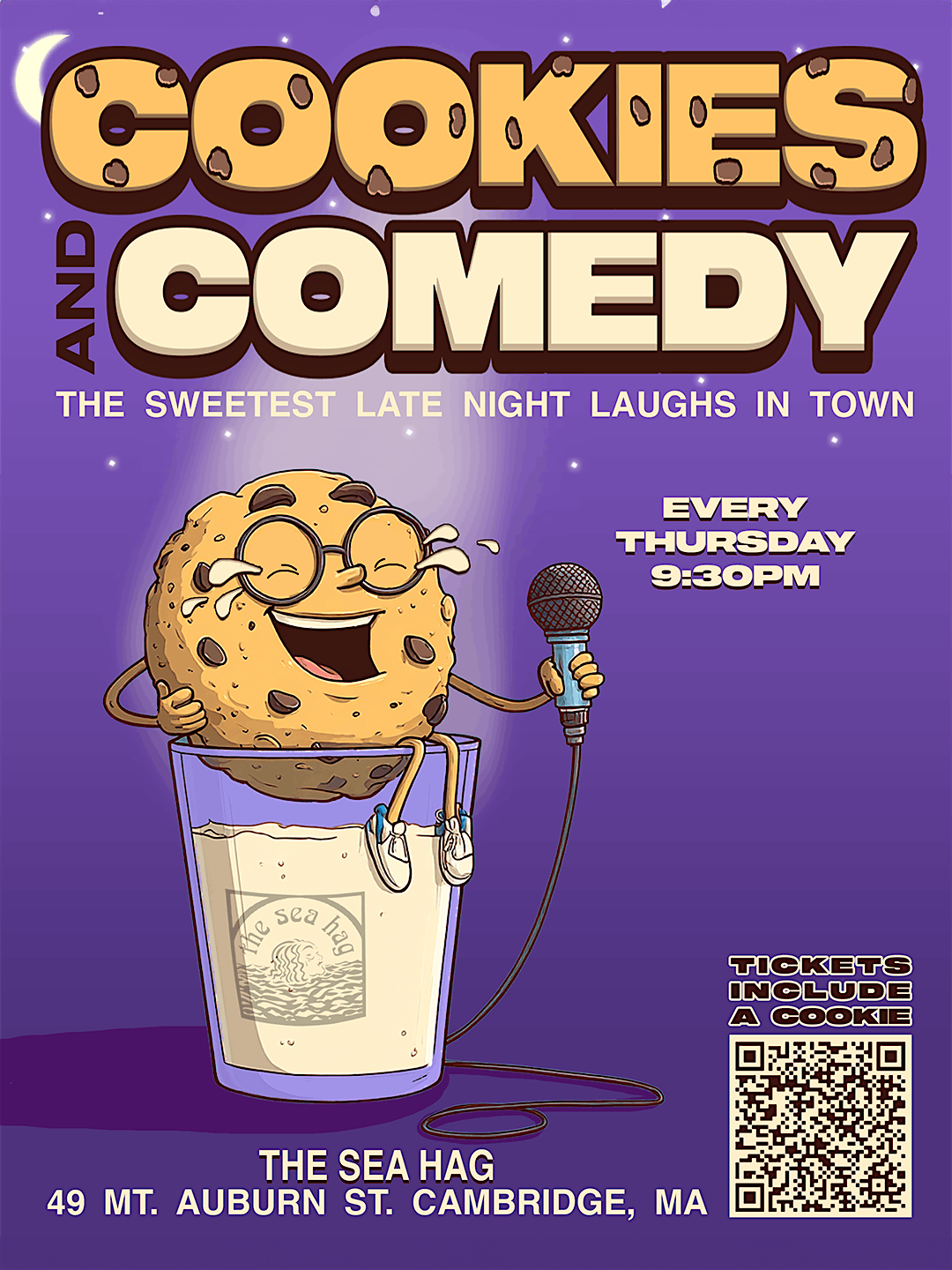 We've got some of the funniest stand-up comics on deck, a cozy, intimate vibe right in the heart of Cambridge... and here's the sweet twist: every ticket comes with a fresh-baked cookie. That's right — comedy and dessert. What more could you want?