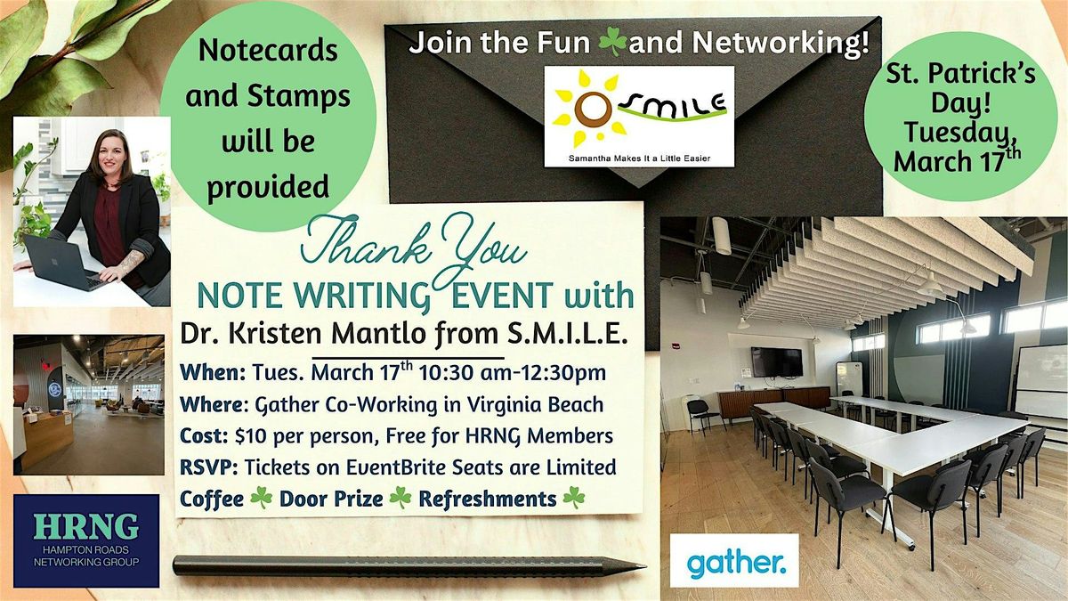 ๐Ah the lost art of the hand-written note! Join us for a St. Patrick's Day Thank You Note Writing & Networking Event hosted by the amazing Kristen Mantlo with S.M.I.L.E. Samantha Makes It a Little Easier. She's Irish-perfect. We will have a Bit o' Irish fun and enjoy some coffee and refreshments. Bring your list of people you'd like to thank and their addresses (optional) and we will provide the Thank you notes, and even some Stamps! Kristen will also teach us some writing etiquette.