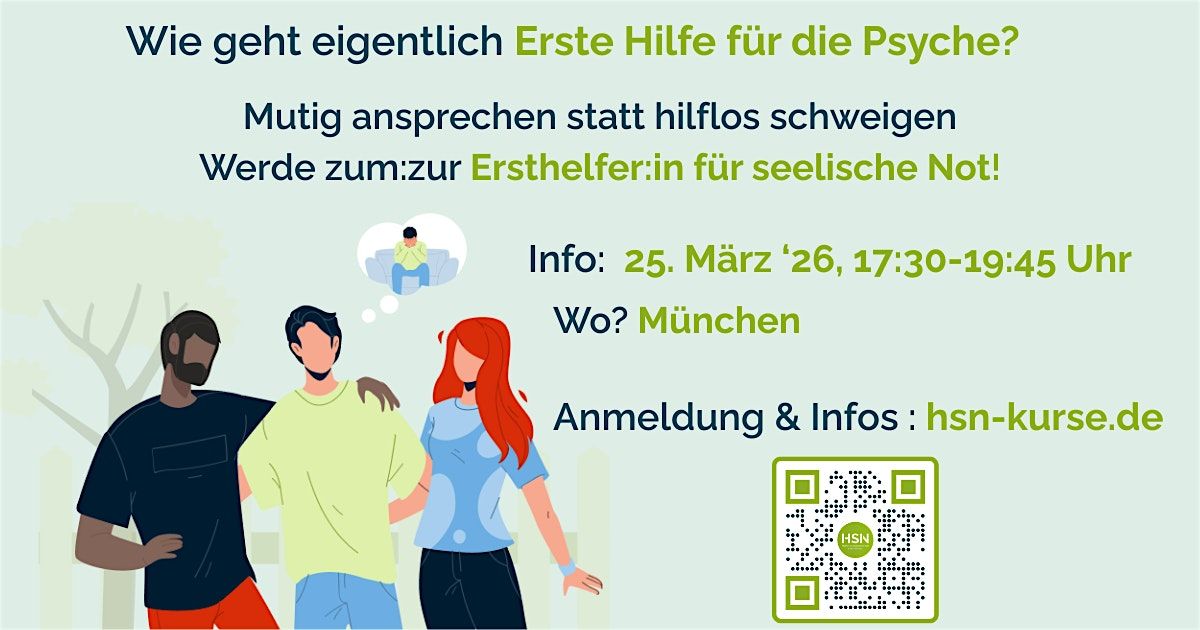 Das Schulungsprogramm des Projektes “Helfen in seelischer Not” vermittelt dem:der Ersthelfer:in, durch eine effektive und zielorientierte Handlungskette: „Hinschauen – Sprechen – Netzwerken“ (HSN), mehr Sicherheit und Selbstvertrauen im Umgang mit Menschen in psychischer Not. Ein praxisnaher Austausch sowie erfahrungsorientierte Übungselemente unterstützen zudem die Erarbeitung konkreter Hilfsangebote gegenüber der betroffenen Person.
