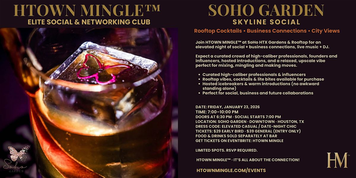 Join HTOWN MINGLE™ at SoHo HTX Gardens & Rooftop for an elevated night of social + business connections, live music + DJ on January 23, 2026 at 7:00 PM (Central Time) for an unforgettable experience under the stars. Let's connect, dance, and mingle with Houton's elite Christian professionals as the live DJ spins the hottest tracks. Currated intros, same-day SmartMatch™ connections.