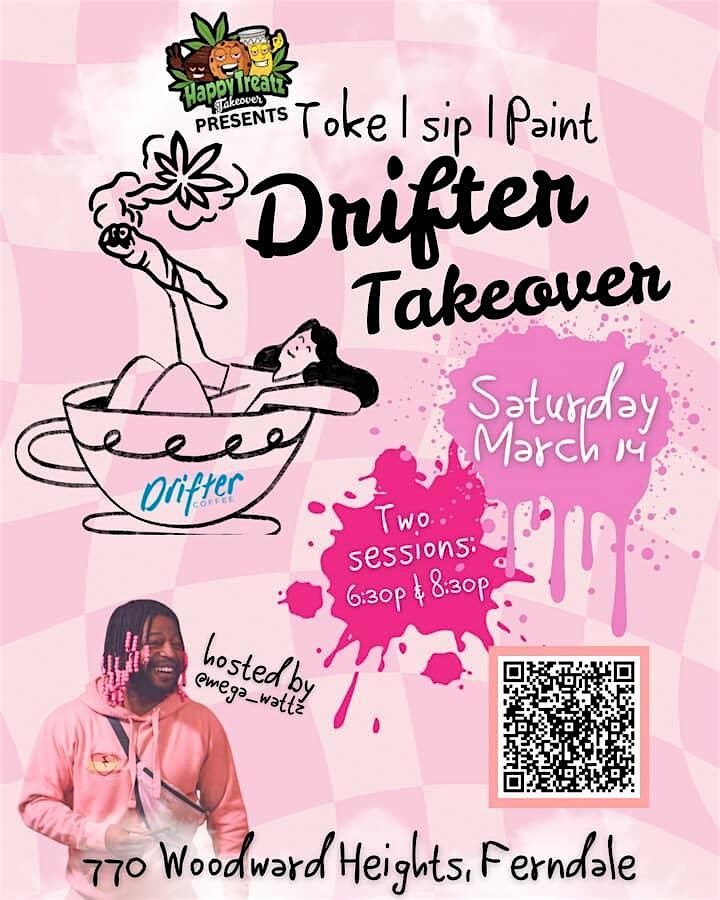 Come join us for a chill evening at Drifter Coffee on March 14, 2026 at 6:00 PM for a unique experience! Let's drift away with good vibes, creative strokes, gud smoke and tasty sips. Great food on site from @foodbynae__(her IG) for you get the munchies. experience needed, just bring your artistic spirit and we'll provide the rest, 2 sessions to choose from. See you there!