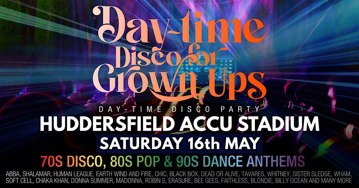 The legendary Discos for Grown ups disco party is coming to the beautiful Riverside Club at Huddersfield FC Accu Stadium for a DAY-TIME disco party