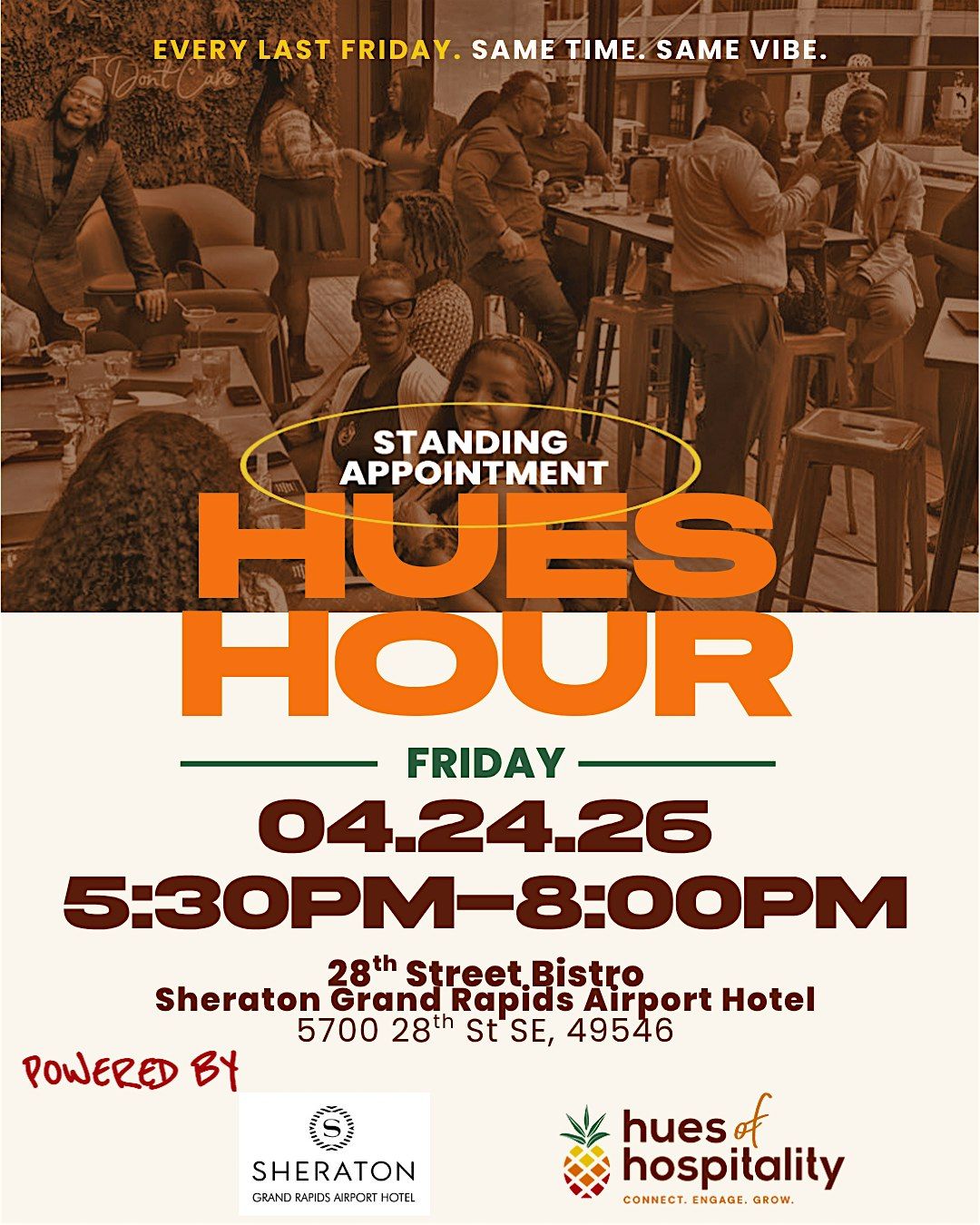 This month's Hues Hour is Powered by 28th Street Bistro, and it's an extra special one. One year ago, we held our very first Hues Hour — and look at us now. We're still showing up, still building, and still making space for the people who make this industry great. This one's worth celebrating.