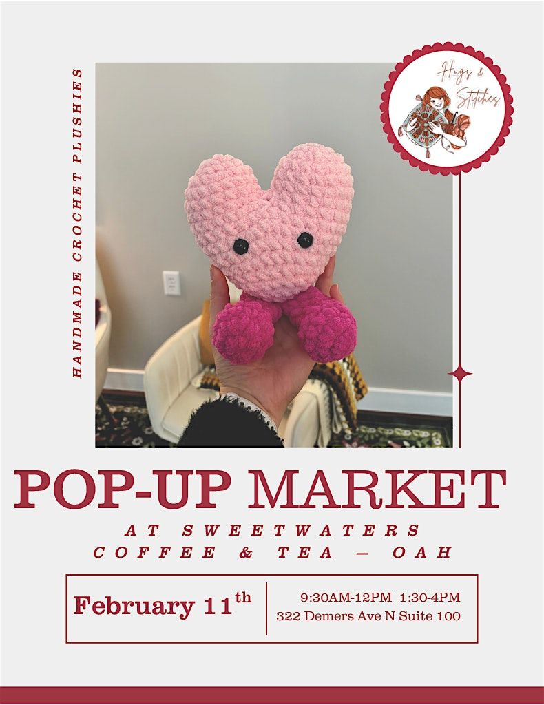 Welcome to the Hugs & Stitches PopUP event! Join us at Sweetwaters Coffee & Tea on February 11, 2026 from 9:30am-12:00pm and 1:30pm-4:00pm for a cozy and crafty display of purchasable works by Hailee Durley. Just in time for Valentine's Day, don't miss out on this opportunity to relax, chat, and get inspired! See you there!