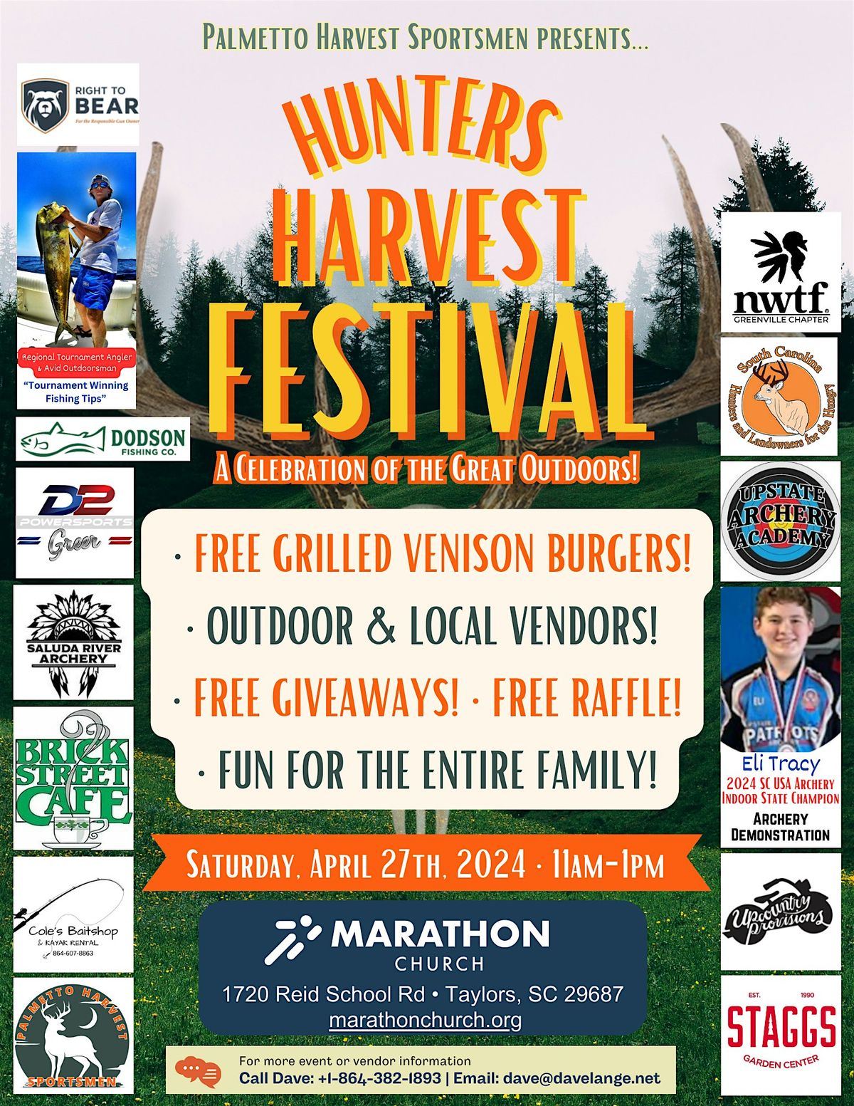 Welcome to the HUNTERS HARVEST FESTIVAL - A Celebration of the Great Outdoors! Join us on Sat Apr 27 2024 at 11:00 AM at the Marathon Church Parking Lot for a day filled with fun and excitement! This event is all about embracing nature, enjoying outdoor activities, and connecting with fellow outdoor enthusiasts. From free grilled venson burger to archery and fishing demonsrations to four-wheelers and monster trucks, there's something for th entire family to enjoy. We will be havign a FREE raffle for lots of great stuff! Don't miss out on this FREE event celebrating the beauty of the great outdoors!