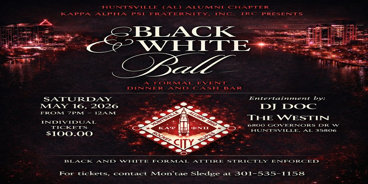 A Night of Elegance and Achievement!Join the Huntsville (AL) Alumni Chapter of Kappa Alpha Psi Fraternity, Inc. for our highly anticipated Black & White Ball! Get ready for an evening of sophisticated style, fine dining, and community celebration in the heart of Rocket City.