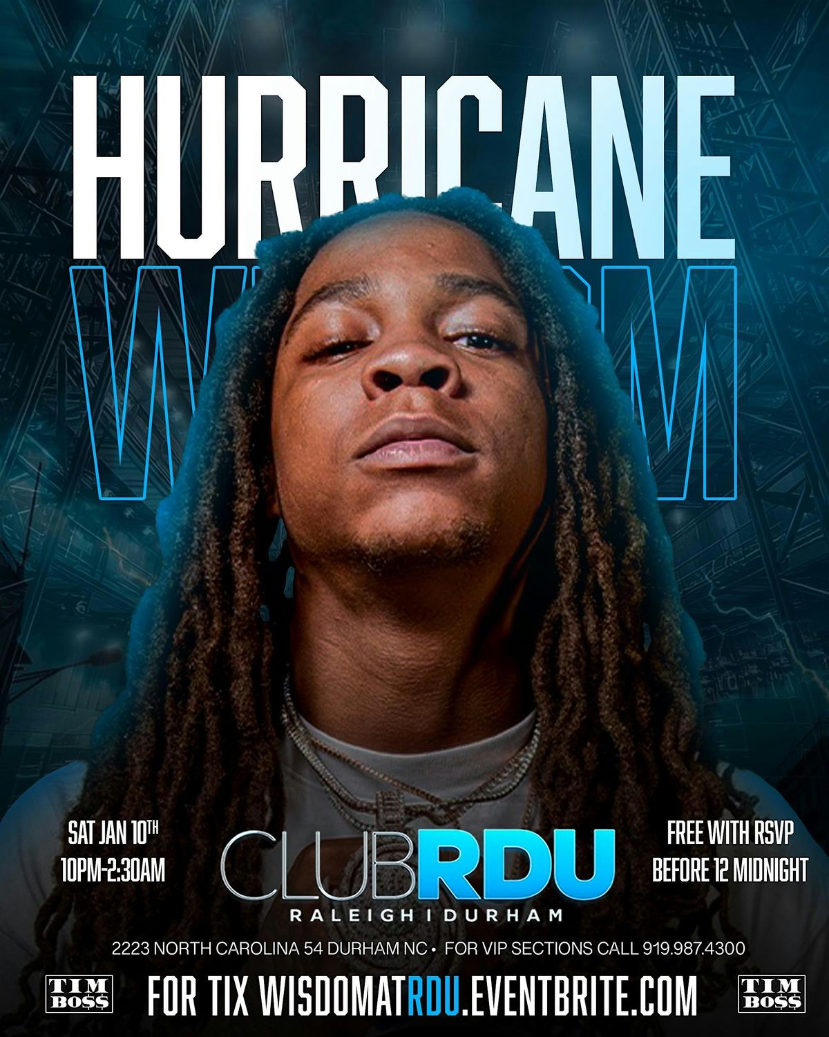 Hurricane wisdom shuts down club Rdu Saturday January 10th for the first time ever , this event will be epic for vip booths call 9199874300