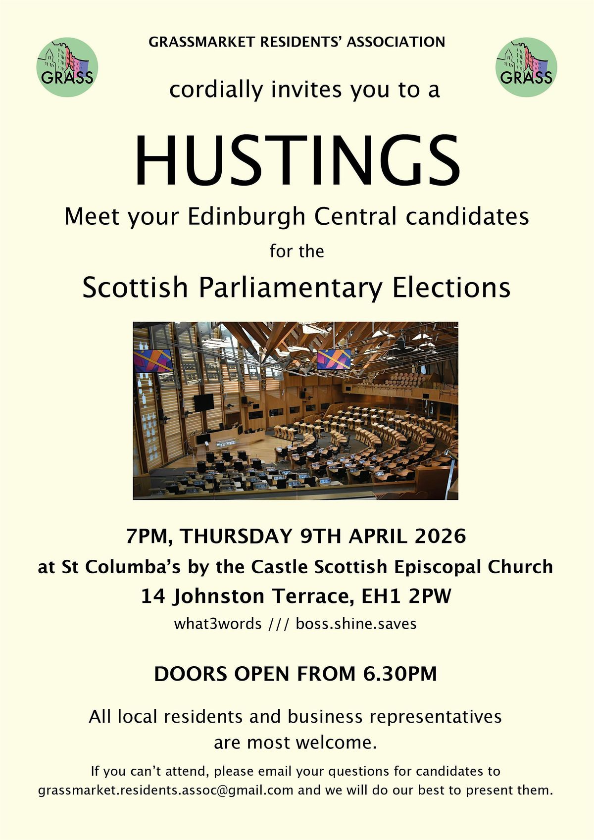 Grassmarket Residents' Association (GRASS) invite you to a free hustings for Central Edinburgh candidates for the Scottish Parliamentary elections. Come along and make your voice heard – residents and local businesses all welcome. If you can’t attend, please email your questions for candidates to [email protected] and we will do our best to present them. Doors open 6.30pm, prompt start 7pm.
