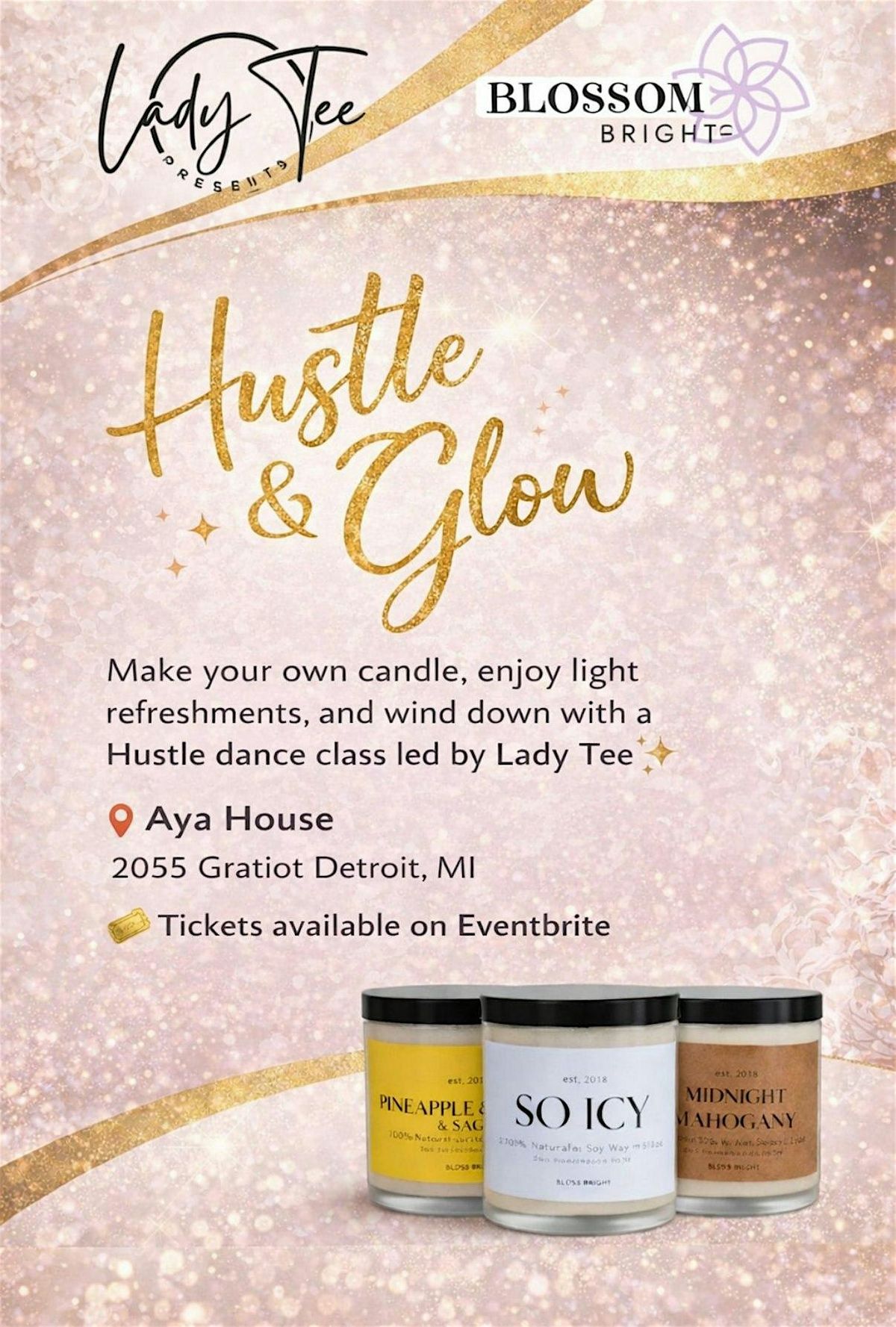 Friday April 24th 6-8pm you'll learn how to create your own soy candle with a variety of fragrance options to appease your scent palate. Everyone will leave with an 8 ounce soy candle. There will be music, light refreshments, & an exciting hustle lesson led by Lady Tee to end the evening