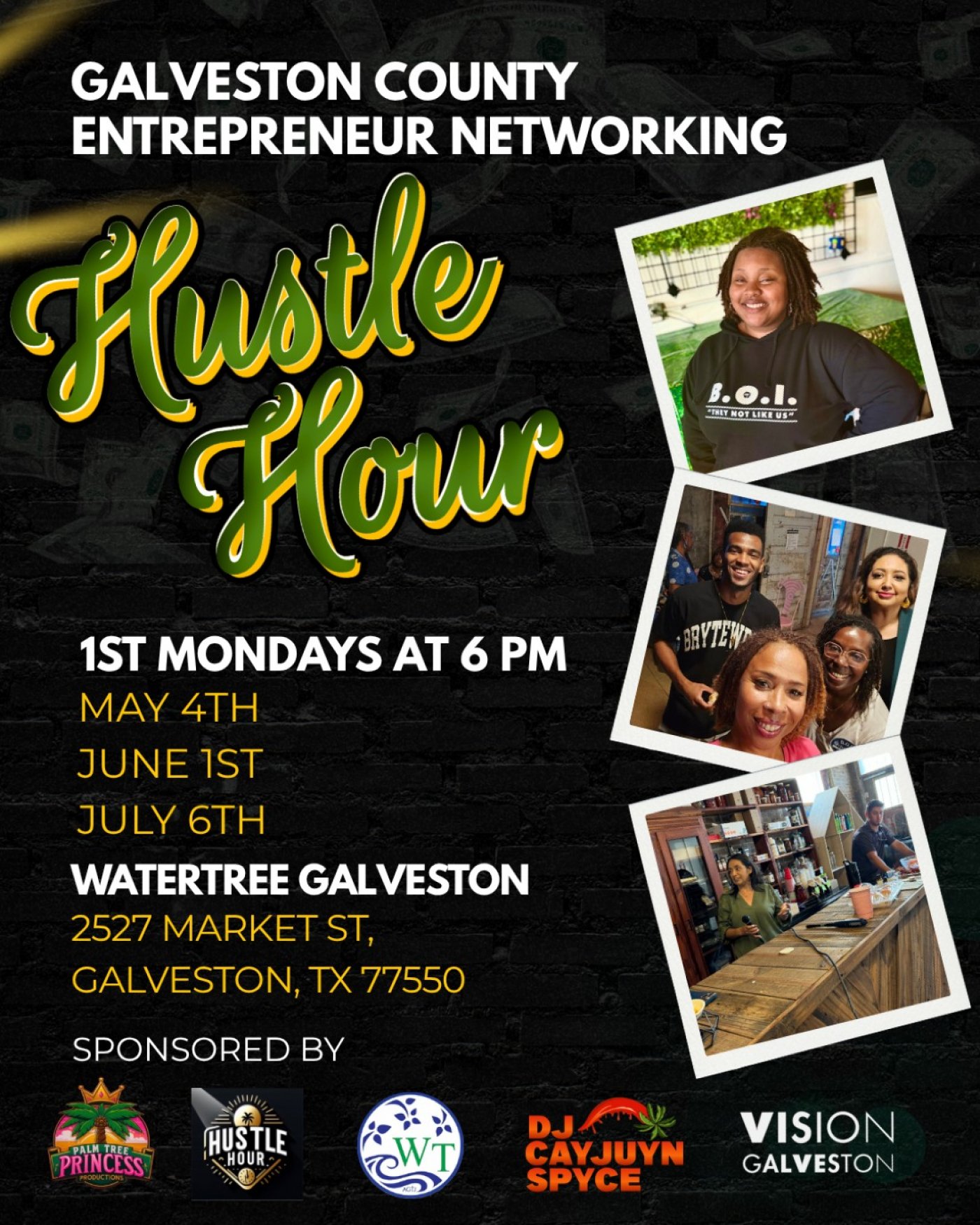 Hustle Hour is Galveston’s unique networking experience dedicated to entrepreneurs. We invite you to kick back and relax while we bridge the gap between businesses across the island and beyond. Hustle Hour is Galveston’s exclusive networking experience dedicated to entrepreneurs. We invite you to relax while we bridge the gap between businesses across the island and beyond. Hustle Hour features a live DJ, light bites, and insightful conversations. Proudly sponsored by Palm Tree Princess Productions, Water Tree Galveston, DJ CAYJUYN SPYCE, and Vision Galveston.