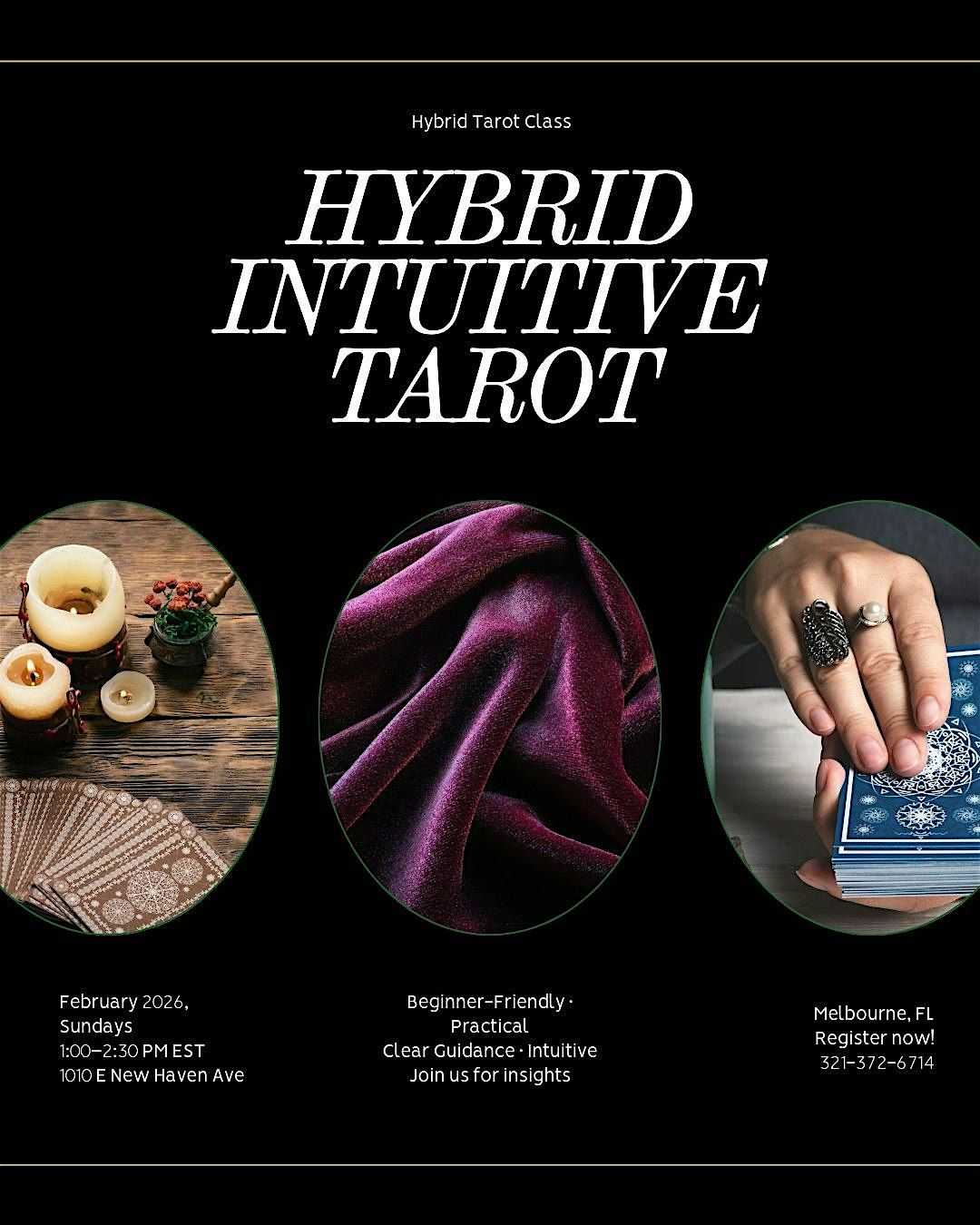 Join us for the Hybrid Intuitive Tarot Reading Class, an 8-session immersive experience designed for beginners who want to learn tarot without memorization or confusion. Whether you're attending in person in Melbourne, FL or joining us virtually via Zoom, you'll gain foundational skills to confidently read tarot cards using intuition and structured guidance.