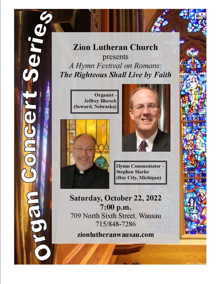 Dr. Jeffrey Blersch will be Zion’s guest organist for this festival. The Rev. Stephen Starke, who wrote several hymns in Zion’s hymnal, will provide commentary.