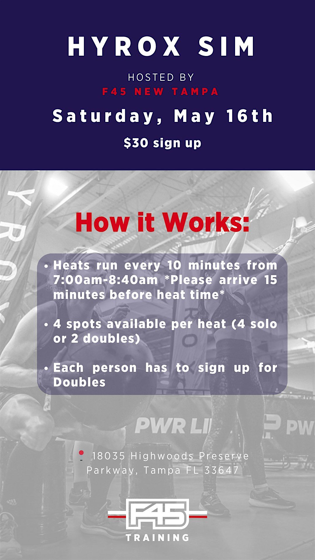 Get ready to test your limits and experience the intensity of a HYROX-style race right here at F45 Training New Tampa. Whether you're preparing for your next competition or just looking for a new challenge, this simulation is designed to push your strength, endurance, and grit—with options that make it accessible for all fitness levels.