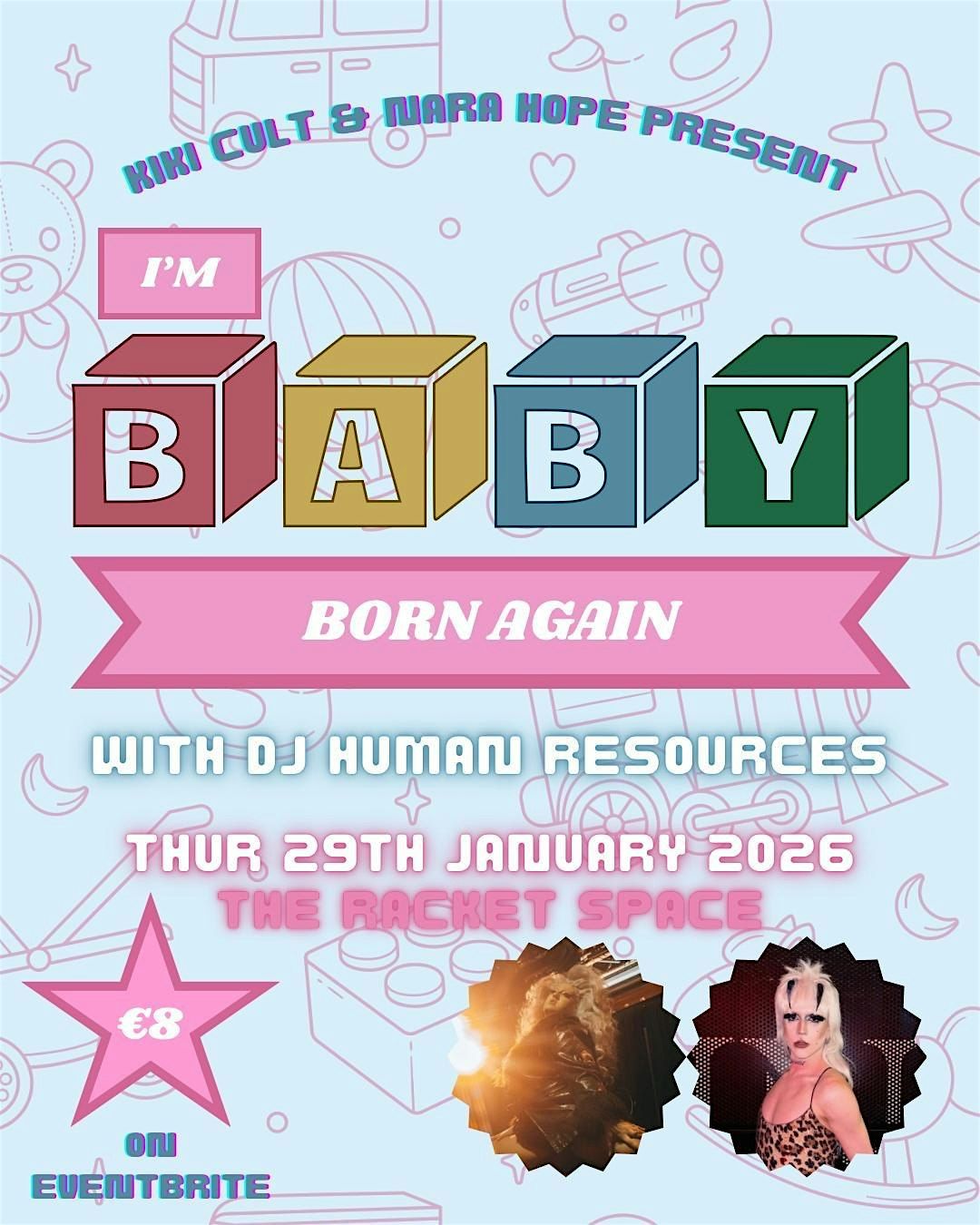 "i'm baby: born again" hosted by kiki cult and nara hope is a revival of the classic old show which found some of dublins hottest new things. The 29th of January in the racket space, An open stage consisting of entirely new drag queens, kings, and things with special performances from Kiki Cult and Nara Hope themselves. Music from DJ Human Resources after.