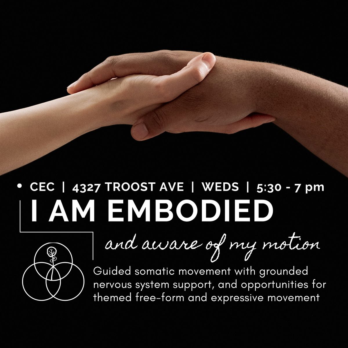 The experience begins with grounding and mindful presence, then opens into themed, self-directed movement pathways that allow each participant to move in ways that feel responsive and true in the moment. The session closes with reflection in circle, supporting real world re-integration and present awareness.