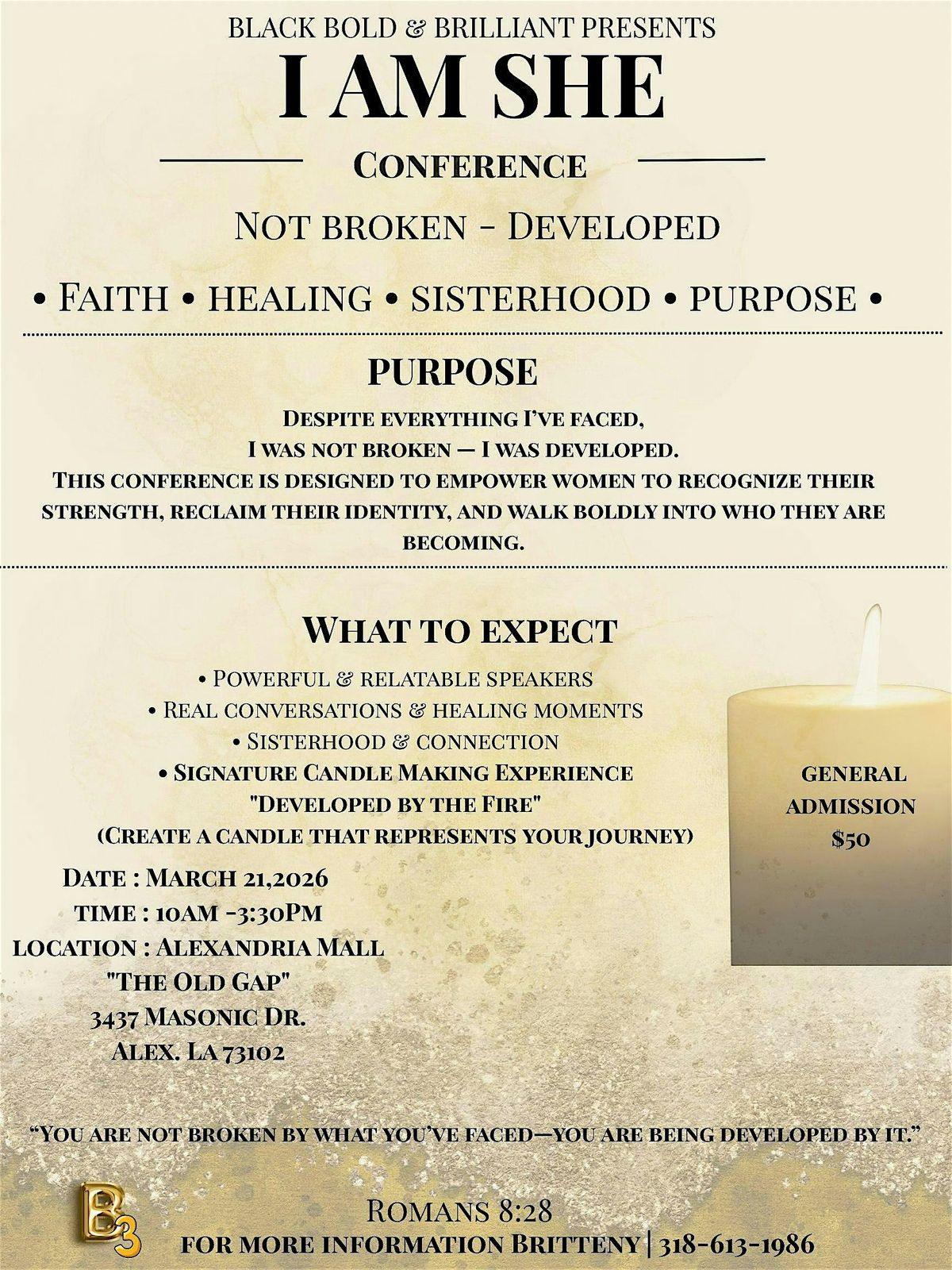 Rooted in Romans 8:28, this conference affirms that every season—both the painful and the purposeful—can be used for good. Whether you are navigating a difficult chapter, rediscovering your confidence, or simply seeking community and encouragement, I Am SHE is for you.