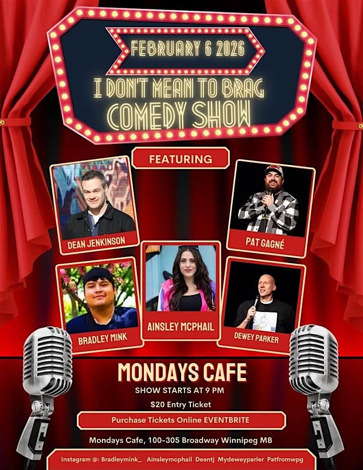 Don’t miss I Don’t Mean to Brag, a live stand-up comedy night happening Friday, February 6 at 9:00 PM in a more intimate, cozy setting at Mondays Café. Same show, same lineup — just a new venue.