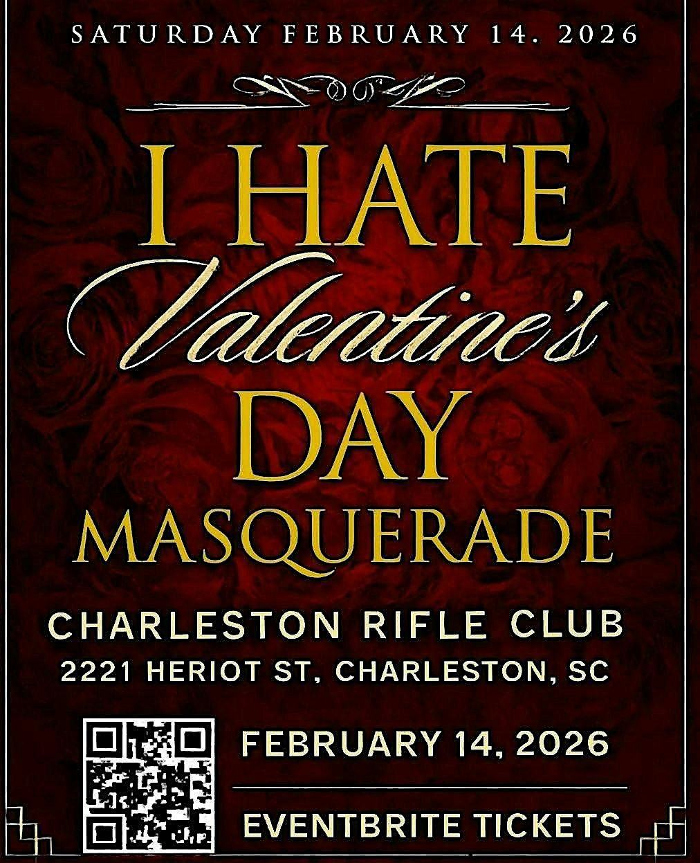 Welcome to the I Hate Valentine's Day Masquerade! Join us at Charleston Rifle Club on February 14, 2026 at 4:00 PM for a night of fun and mystery. Wear your favorite mask and let's celebrate in style. No need to love Valentine's Day to enjoy this event. Let's have a blast together! See you there!