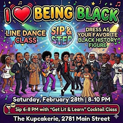 Celebrating Black History Month with Sip & Step the "I Love Being Black" edition! Whether you want to master the art of the cocktail, learn the latest line dances, or just vibe on the dance floor, this is the place to be.