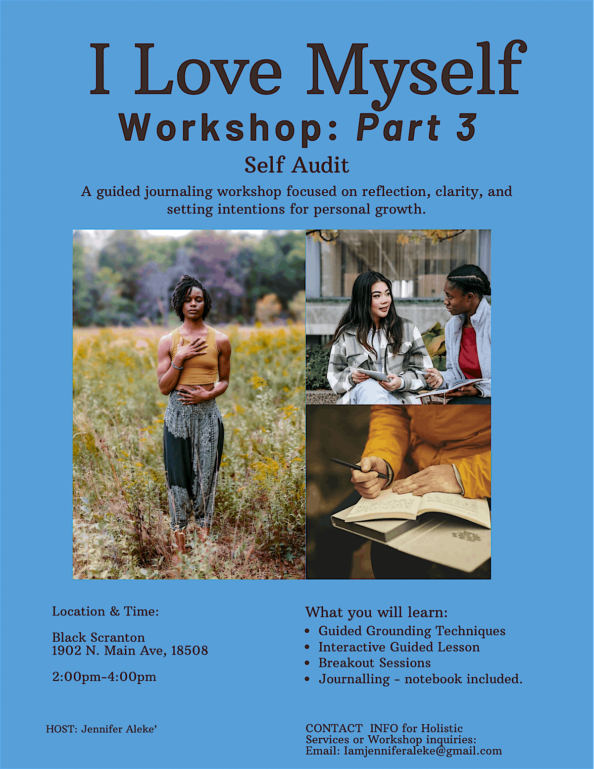 The I Love Myself Workshop: Part 3 – Self Audit is a guided journaling and self-reflection experience focused on grounding, clarity, and setting intentions for personal growth. Facilitated by Jennifer Aleke’, this workshop incorporates guided grounding techniques, reflective journaling, and intuitive energy-based practices in a supportive, community-centered space. This experience is intended for self-help and personal reflection and is not a substitute for professional medical or mental health care. Jennifer Aleke’ is not a licensed therapist or mental health practitioner. Participants with a history of mental health challenges are encouraged to consult a licensed professional before attending and to honor their personal needs throughout the session.
