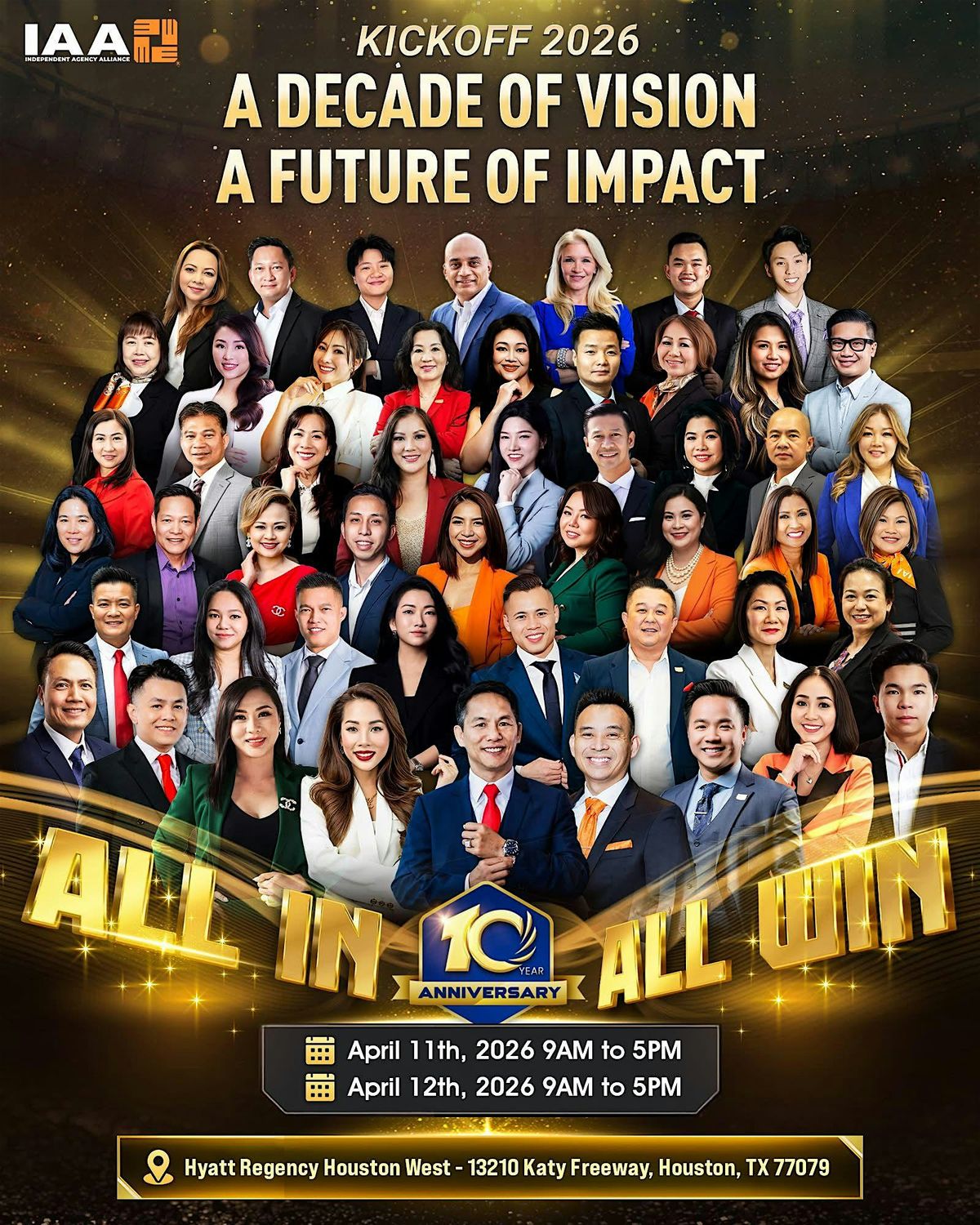 For 10 years, IAA has been a beacon of leadership, financial protection, and professional growth. This 10th Anniversary Kickoff is a two-day high-performance conference at the Hyatt Regency Houston West, where vision meets impact.