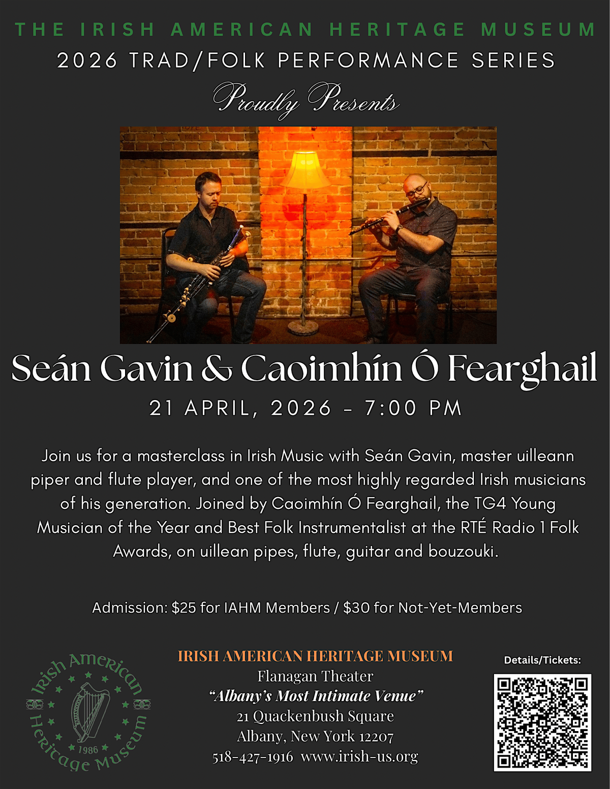 Join us this April 21, 2026, for Seán Gavin and Caoimhín Ó Fearghail - at the Irish American Heritage Museum's Flanagan Theater (Albany's most intimate venue).