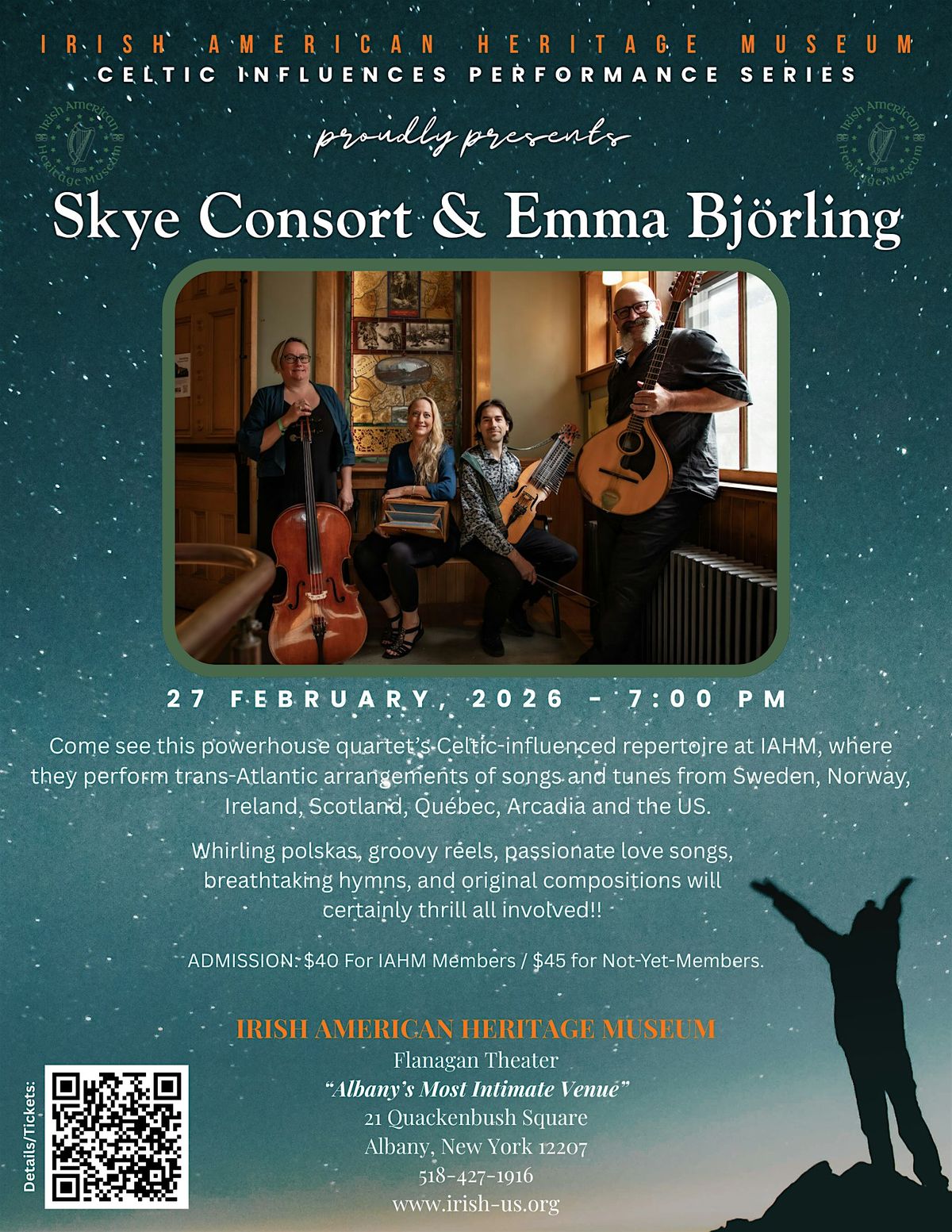 On Friday, February 27, 2026 at 7:00 PM, IAHM welcomes Skye Consort & Emma Björling, a band that Lyra Magazine (Sweden) called "trans-Atlantic Chamber Folk," a genre that is unique among folk artists and classical chamber ensembles. Through Skye Consort & Emma Björling's love of different folk traditions and baroque styles, the band uncovers and presents many haunting texts and sonic elements from different worlds that take audiences on an unforgettable journey.